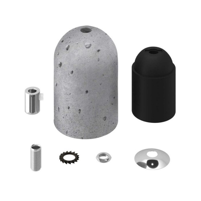 Die Betonfassung E27 Concreta besteht aus mehreren, präzise verarbeiteten Teilen, die genau zueinander passen und ein kompaktes, funktionales Ganzes bilden. Sie setzt sich aus dem äußeren Gehäuse (dem dekorativen Mantel) und der eigentlichen, zum Halten einer Glühbirne bestimmten funktionalen Fassung zusammen: