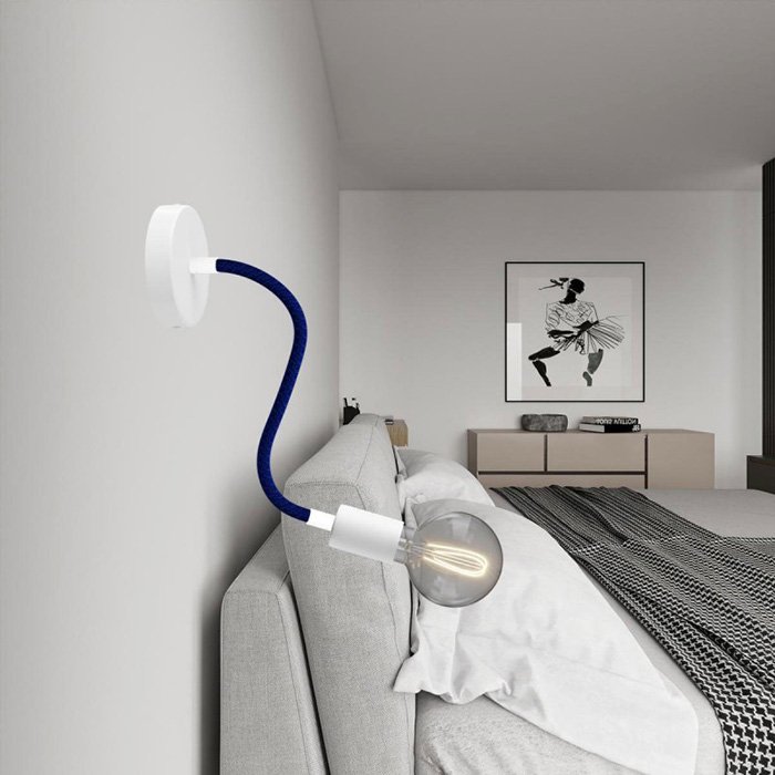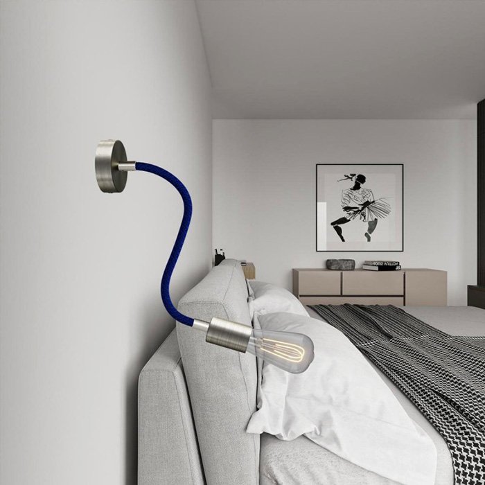 Der blaue Schwanenhals für Lampen und kreative Lichtinstallationen Flex RM20 ist eine hervorragende Wahl für all jene, die originelle Leuchten schaffen oder mit verschiedenen Montagearten von Leuchten experimentieren wollen. Er ermöglicht ein Neigen, Schwenken und Verbiegen und ist an beiden Enden mit einer Gewindehülse M10 ausgestattet. Im Innern befindet sich bereits ein Kabel 2×0,75 mm², das an beiden Enden herausragt, was das Anschließen von Komponenten wie Kabelabdeckungen für Lampen oder Lampenfassungen vereinfacht.
