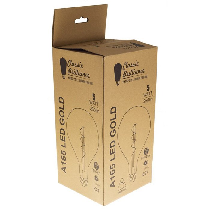 Die bernsteinfarbene dimmbare LED-Glühbirne E27 aus der Kollektion Curved Filament ist ein energiesparendes Leuchtmittel mit einer langen Lebensdauer. Dank der markanten XL-Silhouette in Tropfenform A165 (Drop - an der breitesten Stelle Ø 165mm) harmoniert sie perfekt mit herkömmlichen Leuchten und verbindet klassisches Design mit moderner LED-Technologie in Gestalt eines spiralförmigen Filament-Glühfadens. Dieser macht die Glühbirne zu einem attraktiven Detail, das sowohl in ein- als auch ausgeschaltetem Zustand heraussticht. Die erstklassige technische Verarbeitung und die renommierte Qualität der Marke DayLight garantieren erstklassige Leuchteigenschaften, eine hohe Effizienz und maximale Zufriedenheit beim täglichen Gebrauch.