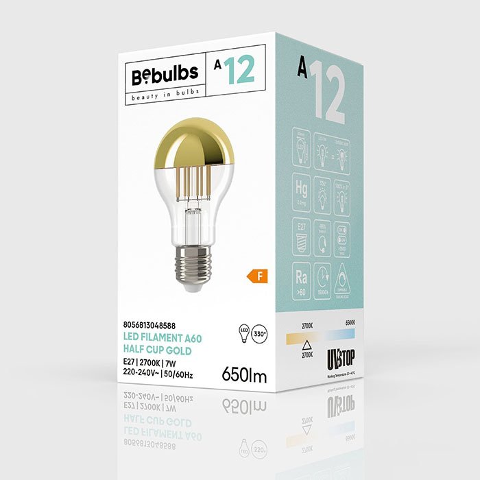 Die dimmbare LED-Glühbirne mit goldfarbenem Spiegelkopf BeBulbs-AG mit E27 Gewinde ist ein spezieller Typ eines dekorativen Leuchtmittels, das Funktionalität mit einem ästhetischen Effekt kombiniert. Dank der traditionellen Tropfenform A60 (Globe - an der breitesten Stelle Ø 60mm) harmoniert sie perfekt mit herkömmlichen Leuchten und verbindet klassisches Design mit moderner LED-Technologie. Die präzise technische Verarbeitung und die renommierte Qualität der Marke BeBulbs garantieren erstklassige Leuchteigenschaften, eine hohe Effizienz und maximale Zufriedenheit beim täglichen Gebrauch.