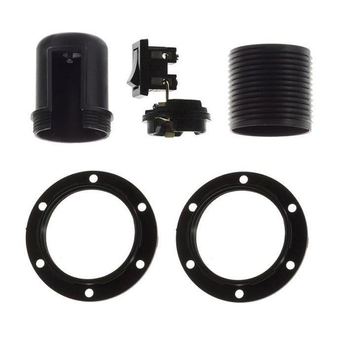 Die E27 Fassung Kunststoff Plastuna-SW besteht aus mehreren, präzise verarbeiteten Teilen, die genau zueinander passen und ein kompaktes, funktionales Ganzes bilden. Sie setzt sich aus dem äußeren Gehäuse (dem dekorativen Mantel) und einem inneren Modul mit Kontakten für das Anschließen von Leitern zusammen: