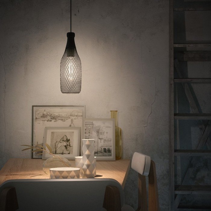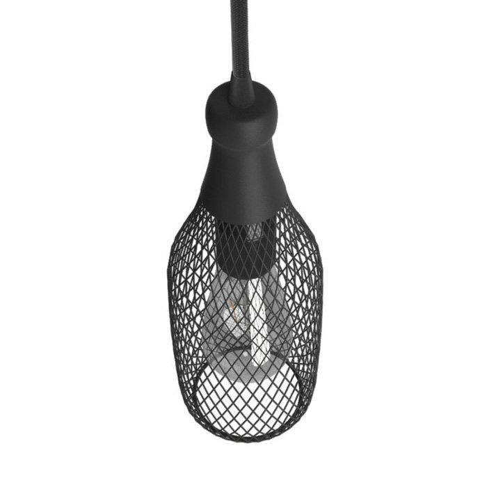 Eine seiner Hauptfunktionen ist der Schutz des Leuchtmittels (der Glühbirne) vor Staub und mechanischer Beschädigung. Die offene doppelte Käfigkonstruktion ermöglicht einen nahezu ungehinderten Lichtdurchgang, wodurch er eine intensive Beleuchtung des Raums sicherstellt. Die Beleuchtung durch die Drahtkonstruktion sorgt für wirkungsvolle Lichteffekte, die dem Raum Dynamik und eine gewisse Atmosphäre verleihen.