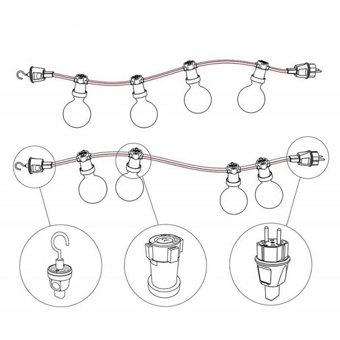 - Der innere und der äußere Teil der Fassung sind aus Thermoplast gefertigt (geeignet für Kabel 2x1,5 mm | verlangt keine Erdung) - moderner technischer Kunststoff, der für seine hohe Festigkeit und Beständigkeit gegenüber mechanischer Beanspruchung bekannt ist. Sein geringes Gewicht reduziert gleichzeitig die Last der gesamten Leuchte, ohne ihre Stabilität oder Zuverlässigkeit zu beeinträchtigen. Ein praktischer Vorteil ist die Möglichkeit des verdeckten Anschließens eines Kabels in zwei Richtungen, was Sie insbesondere beim Zusammenstellen von Lichterketten zu schätzen wissen werden. Eine den Lampensockel fest umspannenden Dichtungsmembran sorgt für eine zuverlässige Abdichtung, wodurch bei Verwendung der Glühbirnenformen A60, ST64, G95 und G125 die Schutzart IP44 erreicht werden kann.