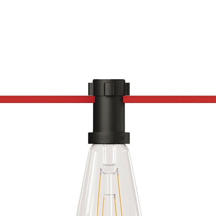 Die Kunststoff Illu-Lampenfassung E27 T-Plastrig ist für das Anschließen von Stromkabeln mit den Maßen 13,5 x 5,5 mm bestimmt. Aus unserem Angebot empfehlen wir Kabel und Komponenten des Systems Lumet-IP44, mit denen Sie eine 100%ige Produktkompatibilität und nahezu unbegrenzte Möglichkeiten beim Entwerfen und der Umsetzung einer Beleuchtung mittels einer Lichterkette erhalten.