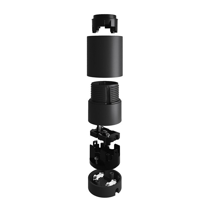 Die Kunststoff Illu-Fassung E27 für eine aufgesetzte Montage T-Plasticap besteht aus mehreren, präzise verarbeiteten Teilen, die genau zueinander passen und ein kompaktes, funktionales Ganzes bilden. Sie setzt sich aus dem äußeren Gehäuse (dem dekorativen Mantel) und der eigentlichen, zum Halten einer Glühbirne bestimmten funktionalen Fassung zusammen: