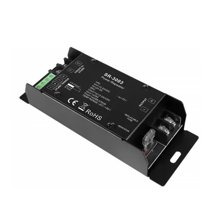 Der einkanalige LED-Amplifier für ein PWM-Signal mit der Bezeichnung SR-3003 ist für eine Erweiterung und Verstärkung eines Steuersignal in Niedervolt-LED-Installationen DC 12-24V bestimmt. Er dient zur Übermittlung eines PWM-Signals aus einem LED-Dimmer oder Controller an LED-Streifen oder Module ohne Einbußen bei der Qualität des Steuersignals. Der Verstärker kontrolliert die Helligkeit nicht selbst, sondern kopiert das eingehende PWM-Signal (Dimmen, Farben, Dynamik) und verstärkt es auf einen höheren Strom und eine höhere Leistung. Dank dessen können größere Längen von LED-Streifen oder mehr Lichtschaltkreise gesteuert werden, als es das eigentliche Steuerungselement erlaubt. Der Verstärker zeichnet sich durch Zuverlässigkeit und eine hohe Verarbeitungsqualität aus, hinter der die renommierte Marke Lux Miners by Sunricher steht.