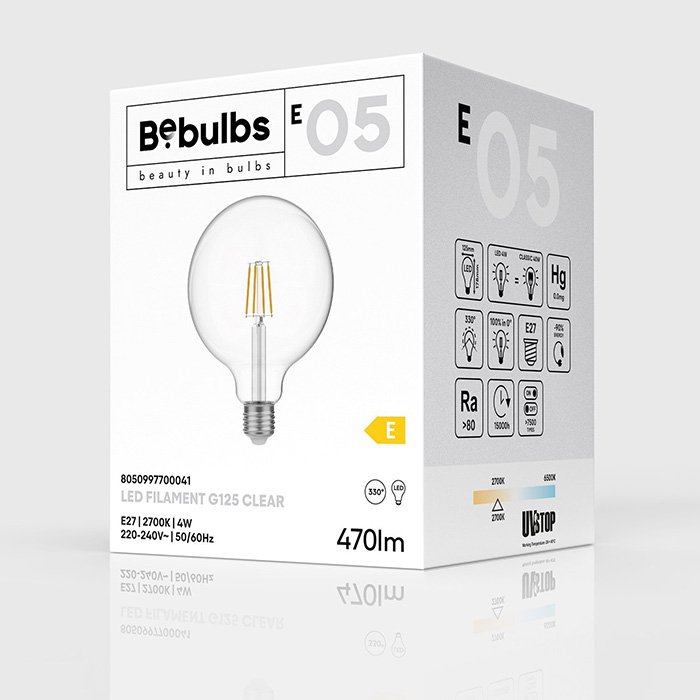 Die klare LED-Glühbirne BeBulbs-E mit E27 Gewinde ist ein energiesparendes Leuchtmittel mit einer langen Lebensdauer. Dank der dominanten, globusartigen Form G125 (Globe - an der breitesten Stelle Ø 125mm) harmoniert sie perfekt mit herkömmlichen Leuchten und verbindet klassisches Design mit moderner LED-Technologie. Die präzise technische Verarbeitung und die renommierte Qualität der Marke BeBulbs garantieren erstklassige Leuchteigenschaften, eine hohe Effizienz und maximale Zufriedenheit beim täglichen Gebrauch.