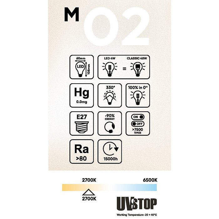 Die LED-Glühbirne BeBulbs-M A60 können Sie überall dort verwenden, wo Funktion auf Design trifft. Sie dient hervorragend als Ersatzleuchtmittel für Ihre Leuchte, aber auch als Bestandteil bei der kreativen Fertigung einer eigenen Leuchte. Für individuelle Projekte empfehlen wir, #tablink#objimky#E27 Fassungen## oder weitere Komponenten für Leuchten zu verwenden, mit denen Sie originelle Leuchten genau nach Ihren Vorstellungen gestalten können. Die Integration der nicht dimmbaren Glühbirne in Smart-Home-Anwendungen können Sie mithilfe kompatibler #tablink#spinace#Schalter 230V AC## vornehmen.