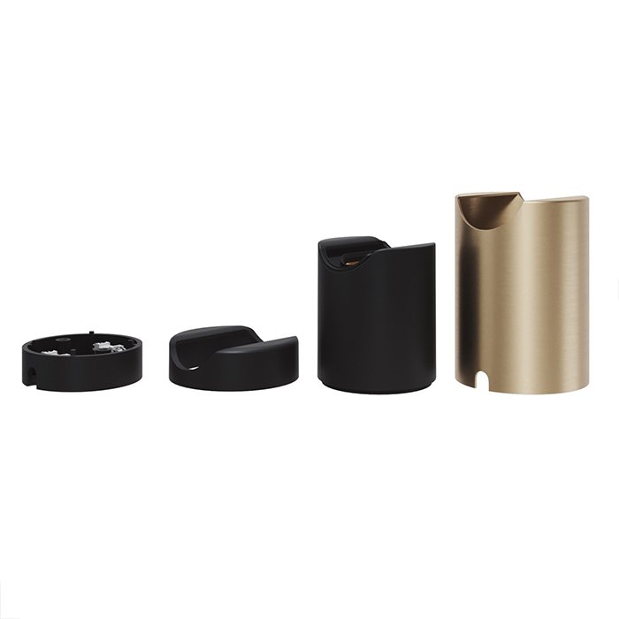 Die Metall Illu-Fassung S14D für eine aufgesetzte Montage T-Metaless besteht aus mehreren, präzise verarbeiteten Teilen, die genau zueinander passen und ein kompaktes, funktionales Ganzes bilden. Sie setzt sich aus dem äußeren Gehäuse (dem dekorativen Mantel) und der eigentlichen, zum Halten einer Glühbirne bestimmten funktionalen Fassung zusammen: