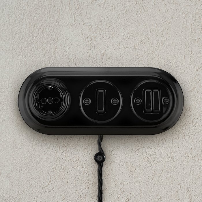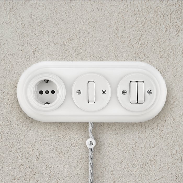 Der Porzellan-Dreifachrahmen für Schalter oder Steckdosen 3P-Frame ist mit allen Stromkabeln bis zu einem Durchmesser von 8,5 mm kompatibel. Aus unserem Angebot können Sie Kabel und Komponenten des Systems COMPACT 62 (3x0,75 mm²) oder MIDI 85 (3x1,5 mm²) auswählen. Für die Realisierung einer Aufputzinstallation empfehlen wir, kompatible #tablink#montaz#Schalter und Steckdosen## zu verwenden. Dank seiner modularen Konstruktion lässt sich der Dreifachrahmen auch gut mit weiteren Elementen des Systems für Porzellan-Beleuchtungskomponenten Porcelain kombinieren. Diese Flexibilität ermöglicht eine einfache Integration in verschiedene Innenraumstile.