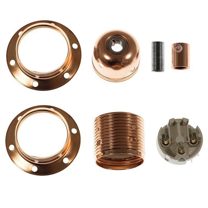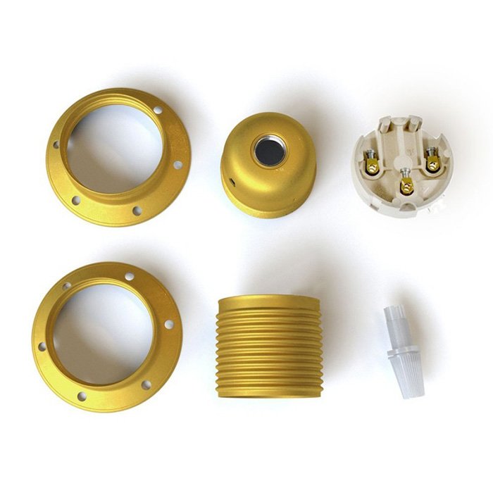 Die Metall-Retro-Fassung E27 mit der Möglichkeit der Montage eines Lampenschirms Metalnut besteht aus mehreren, präzise verarbeiteten Teilen, die genau zueinander passen und ein kompaktes, funktionales Ganzes bilden. Sie setzt sich aus dem äußeren Gehäuse (dem dekorativen Mantel) und der eigentlichen, zum Halten einer Glühbirne bestimmten funktionalen Fassung zusammen: