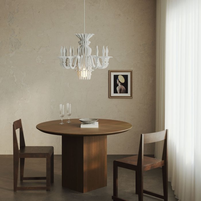 Der schallabsorbierende Lampenschirm aus rPET mit der Modellbezeichnung HYPNOLIER-XL verbindet mehrere funktionale und ästhetische Aspekte. Seine markante Silhouette erinnert an die ikonische, durch schöne Muranoglas-Kronleuchter inspirierte venezianische Ästhetik, jedoch in einem modernen Verständnis. Gefertigt ist er aus einem speziellen Material zur Schallabsorption und Geräuschreduktion im Raum. Somit ist er nicht nur eine ästhetische Dominante, sondern stellt dank der nachhaltigen Materialien auch einen verantwortungsvollen Ansatz für die Fertigung oder Renovierung von Leuchten dar.