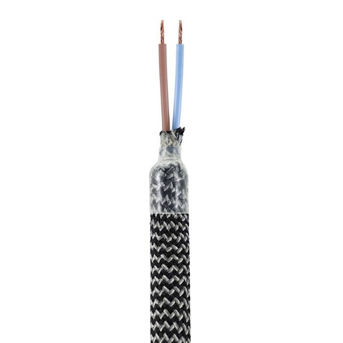Die Oberflächenummantelung mit stahlgrau-schwarzem Zick-Zack-Muster aus Rayon (Viskose) verleiht dem Metallschlauch mit robuster Mechanik eine außergewöhnliche Optik, dank der er nicht nur zu einem funktionalen, sondern auch zu einem ästhetischen Element des Interieurs wird.