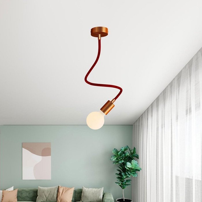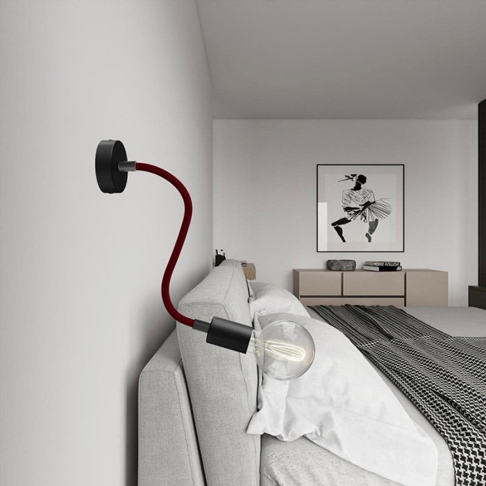 Der weinrote Schwanenhals für Lampen und kreative Lichtinstallationen Flex RM19 ist eine hervorragende Wahl für all jene, die originelle Leuchten schaffen oder mit verschiedenen Montagearten von Leuchten experimentieren wollen. Er ermöglicht ein Neigen, Schwenken und Verbiegen und ist an beiden Enden mit einer Gewindehülse M10 ausgestattet. Im Innern befindet sich bereits ein Kabel 2×0,75 mm², das an beiden Enden herausragt, was das Anschließen von Komponenten wie Kabelabdeckungen für Lampen oder Lampenfassungen vereinfacht.