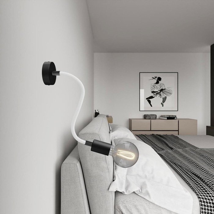 Der weiße Schwanenhals für Lampen und kreative Lichtinstallationen Flex RM01 ist eine hervorragende Wahl für all jene, die originelle Leuchten schaffen oder mit verschiedenen Montagearten von Leuchten experimentieren wollen. Er ermöglicht ein Neigen, Schwenken und Verbiegen und ist an beiden Enden mit einer Gewindehülse M10 ausgestattet. Im Innern befindet sich bereits ein Kabel 2×0,75 mm², das an beiden Enden herausragt, was das Anschließen von Komponenten wie Kabelabdeckungen für Lampen oder Lampenfassungen vereinfacht.