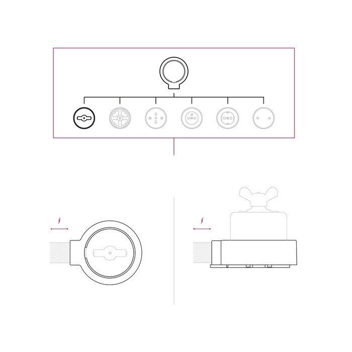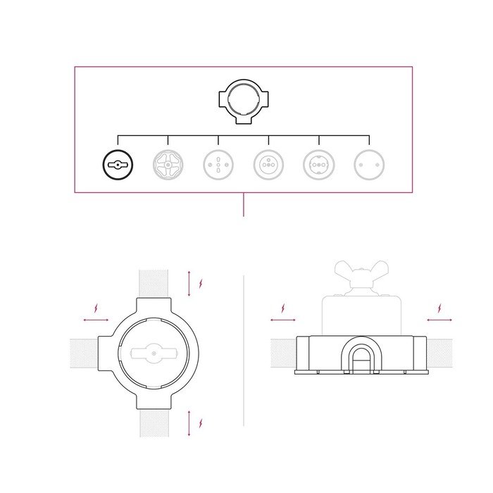 Der Porzellanrahmen des Schalters P-Nut-Base dient als praktisches Montageelement, das das Anschließen von Kabel aus vier unterschiedlichen Richtungen (je nach gewählter Produktvariante) erheblich erleichtert. Dank seiner durchdachten Konstruktionslösung ermöglicht er eine elegante Kabelführung, wobei sämtliche Verbindungen diskret und sicher im Innern des Rahmens verborgen sind.
